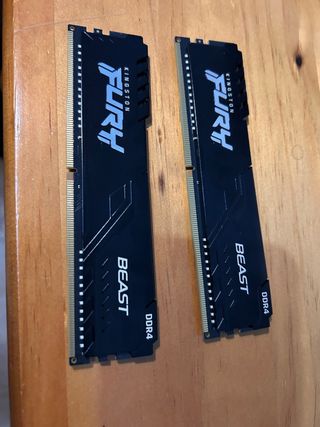 Memoria RAM Kingston FURY Beast DDR4 de 32GB (2x16GB) con una velocidad de 3200 MHz y latencia CL16. - Capacidad total: 32GB - Configuración: 2 módulos de 16GB cada uno - Tipo de memoria: DDR4 - Velocidad: 3200 MHz - Latencia: CL16