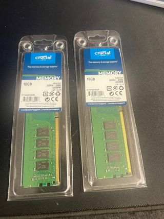 Dos módulos de memoria RAM Crucial para PC de escritorio. - Capacidad: 16GB por módulo (total 32GB). - Tipo: DDR4 UDIMM. - Velocidad: 2666MHz. - Voltaje: 1.2V. - Latencia: CL19.