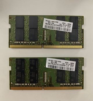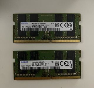 Dos módulos de memoria RAM SODIMM DDR4 de Samsung. - 16GB cada uno (total 32GB). - DDR4 - 3200MT/s