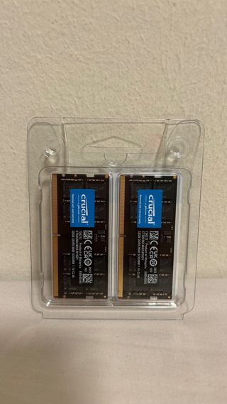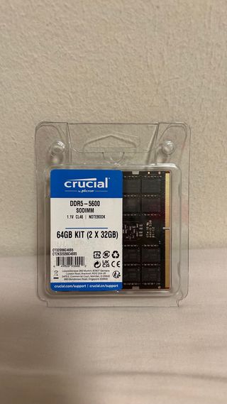 Crucial RAM DDR5 128GB Kit (2x64GB) 5600MHz SODIMM, Memoria para Ordenador Portátil/Laptop o Mini PC. CT2K64G56C46S5. Pack de dos módulos de memoria RAM Crucial DDR5 SO-DIMM. - Capacidad total: 128 GB. - Configuración: 2 x 64 GB. - Tipo: DDR5 SO-DIMM. - Velocidad: 5600 MHz Memoria comprada en Amazon con sus 3 años de garantía. Nueva sin usar. La vendo porque mi portátil nuevo viene con 64 GB y no voy a necesitar 128 GB.