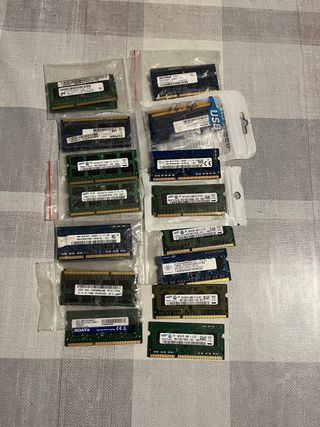 Vendo memorias para portatil/mini pc SO-DIMM DDR4 DDR3L Y DDR3, algunas son nuevas y otras usadas. Adjunto listado y precio unitario (podria rebajar si se compran varias) DDR4: 20€ 1x 4Gb 2133Mh Samsung DDR3L: 8Gb 1600Mh: 20€ 6x 8Gb 1600Mh CL11 Kingston value (nuevos) 4x 8Gb 1866Mh CL13 Crucial (nuevos) 4Gb 1600Mh: 15€ 5x 4Gb 1600Mh CL11 Samsung 5x 4Gb 1600Mh CL11 Micron 5x 4Gb 1600Mh CL11 SK Hynix 3x 4Gb 1600Mh CL11 ADATA 2x 4Gb 1600Mh CL11 Kingston 1x 4Gb 1600Mh CL11 ELPIDA DDR3: 5€ 2Gb 1333Mh: 1x 2Gb 1333Mh CL11 Kingston 2Gb 1066Mh: 1x 2Gb 1066Mh CL11 ADATA 1Gb 1333Mh 1x 1Gb 1333Mh CL9 Kingston Realizo envios.