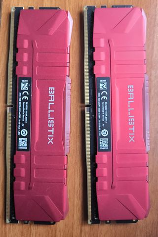 Módulos de memoria RAM DDR4 de alto rendimiento Crucial Ballistix. - Capacidad total: 16GB (2x8GB) - Frecuencia: 3600MHz - Latencia: CL16 - Color: Rojo - Diseño con disipador de calor