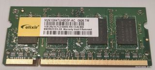 Memoria RAM Elixir de 1GB DDR2 PC2-6400. Testeada y funcional 100% especificaciones: - Capacidad: 1GB - Tipo: DDR2-800 MHz - Velocidad: PC2-6400 - Factor forma: 200 pines SO-DIMM