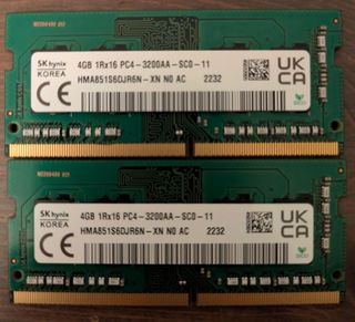 Dos módulos de memoria RAM SK Hynix DDR4 SO-DIMM de 4GB cada uno, para un total de 8GB. Se encuentran en perfecto estado y listos para usar. - Capacidad total: 8GB (2x4GB) - Tipo: DDR4 SODIMM - 3200 MHZ - Marca: SK hynix