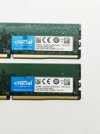dos módulos de memoria RAM Crucial. - Capacidad total: 16GB (2x 8GB). - Tipo: DDR4 UDIMM. - Velocidad: 2400MHz. - Latencia: CL17. - Voltaje: 1.2V. Están verificados. Se hace envío.