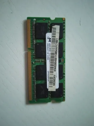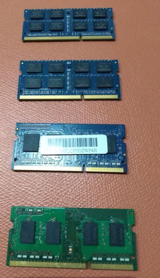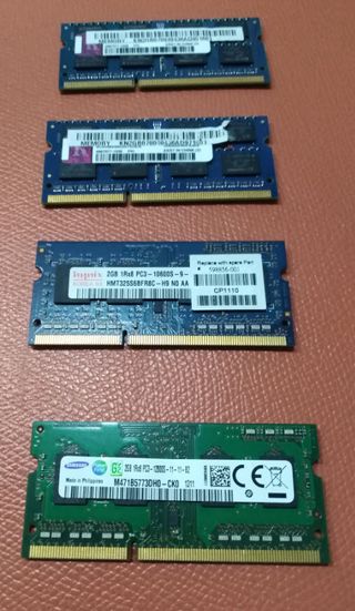 Tarjetas RAM de 2GB. 9€ todas juntas. Solo las vendo por separado en persona. Las dos que vienen juntas son de un ordenador Imac de 2009. Las otras dos son de portátiles de una fecha similar. Caracteristicas: - DDR3 SDRAM - Formato SO-DIMM - Velocidad: DDR3-1066 MHz* - Dual Rank -2 Memorias RAM de Samsung para portátiles: 2GB 2Rx8 PC3 - 8500S - 07 - 10 - F2 (M471B5673FH0-CF8 1032) - 2 Memorias RAM de Micron para iMac: 2GB 2Rx8 PC3 - 8500S - 07 - 10 - F1 ( MT16JSF25664HZ-1G1D1 ) *Compatibles con sistemas que acepten DDR3 1066 MHz SO-DIMM.