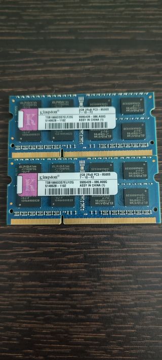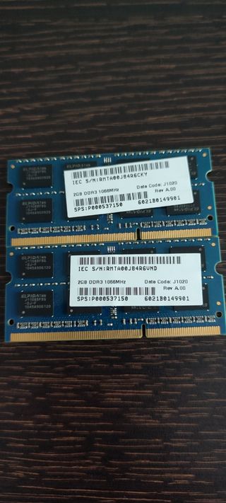 Se venden dos módulos de memoria RAM DDR2 de 2GB cada uno, sumando un total de 4GB. - Marca: ELPIDA - Capacidad por módulo: 2GB - Tipo de memoria: DDR2 - Velocidad: PC2-6400S (800MHz) - Formato: SODIMM (para portátiles)
