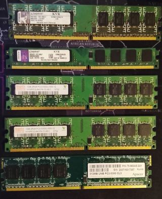 Lote de memorias RAM para PC y portátil, todas comprobadas y funcionando correctamente: --RAM DDR2 Sobremesa-- 1 x Memoria 1GB 667 Kingston KVR DDR2. 1 x Memoria 2GB 667 Kingston KVR DDR2 (perfil bajo). 2 x Memoria 1GB 667 Hynix DDR2. --Memoria DDR2 Portátil-- 2 x Memoria 512MB 533 Hynix SODIMM DDR2 --Memoria DDR3 Sobremesa-- 3 x Memoria 2GB 1600 Corsair XMS3 DDR3 --Memoria DDR3 Portátil-- 1 x Memoria 2GB 1600 Samsung SODIMM EL PRECIO ES SIMBÓLICO. Se escuchan ofertas por unidad o en lotes, también envío por Wallapop.