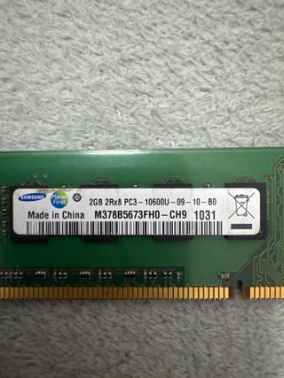 Dos módulos de memoria RAM Samsung. - Capacidad: 2GB por módulo. - Tipo: DDR3. - Fabricante: Samsung. - Modelo: M378B5673FHO-CH9 y M378B5773DHO-CH9.