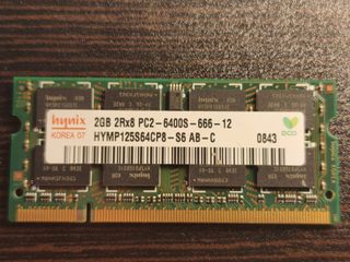 2 Pack de dos módulos de memoria RAM Hynix. - Capacidad: 2 GB por módulo (total 8 GB). - Tipo: DDR2 SODIMM. - Velocidad: PC2-6400 (800 MHz). - Latencia: CL6.