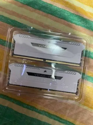 Kit de memoria RAM Corsair Vengeance RGB Pro. - Capacidad total: 32 GB. - Configuración: 2 módulos de 16 GB cada uno. - Tipo de memoria: DDR4. - Diseño con iluminación RGB.
