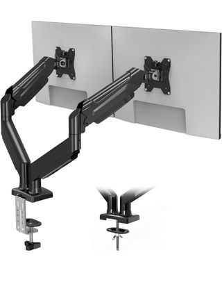 Soporte de brazo doble para monitores, ideal para organizar tu espacio de trabajo. - Construcción robusta y duradera. - Diseño elegante en acabado negro. - Permite ajustar la posición de dos monitores.