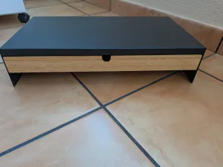 Eleva tu monitor con esta práctica base. - Diseño moderno con superficie negra. - Cajón frontal de madera de bambú. - Patas metálicas negras.