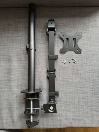 Soporte de brazo para monitor de PC. Diseñado para pantallas de 17 a 27 pulgadas. - Brazo articulado para ajuste de posición. - Base de sujeción tipo pinza o con agujero en la mesa. - Incluye tornillería y llave Allen para montaje.