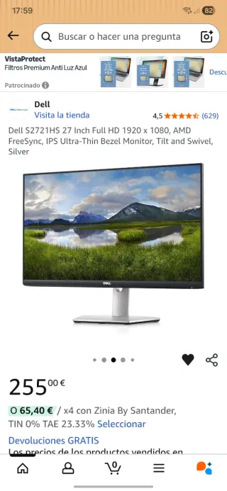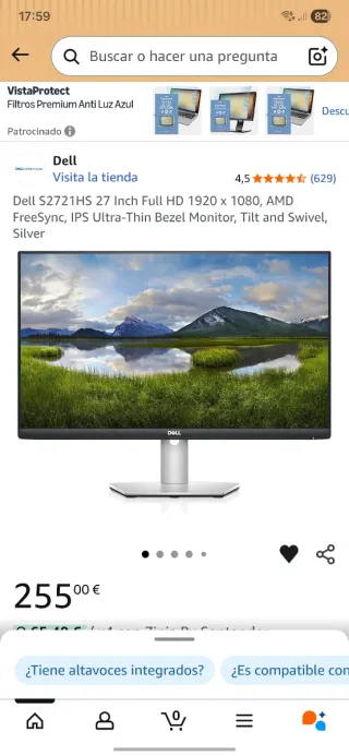 Monitor Dell S2721HS de 27 pulgadas con resolución Full HD. - Panel IPS con tecnología AMD FreeSync. - Diseño Ultra-Thin Bezel. - Soporte con ajuste de inclinación y giro. - Color plateado. En su caja original