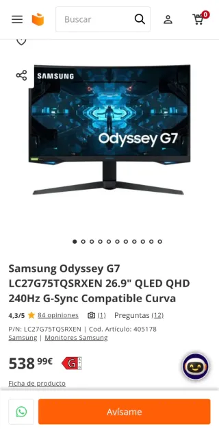 Monitor gaming Samsung Odyssey G7 de 27 pulgadas. - Resolución QHD. - Tasa de refresco de 240Hz. - Compatible con G-Sync y FreeSync - Panel Curvo.