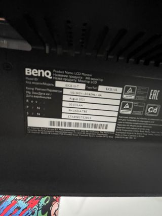 Monitor BenQ de 24 pulgadas con una tasa de refresco de 144Hz y un tiempo de respuesta de 1ms. - Modelo: EX2510-T - Voltaje: 100-240V~50/60Hz, 1.6A - Fecha de fabricación: Agosto 2021