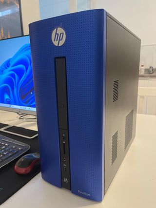 Equipo de sobremesa HP en color azul. 550-130ns Procesador AMD A8-8650 8GB RAM Disco SSD 480GB + Disco SATA 500GB Windows 11 Recien instalado y listo para trabajar o estudiar DVDRW Monitor HP 24” 24fw