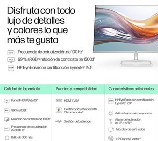 Monitor HP de 27 pulgadas con resolución Full HD. Diseño moderno con base plateada. - Pantalla de 27 pulgadas. - Resolución Full HD (1920 x 1080). - Panel IPS para colores vibrantes y amplios ángulos de visión. - Diseño elegante con biseles delgados.