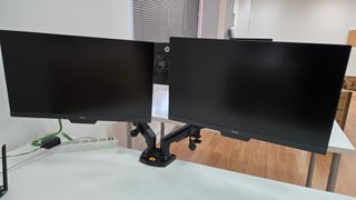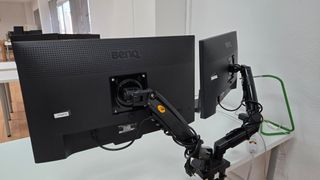 Monitor BenQ PD2500T en color negro. - Pantalla de 25 pulgadas. - Resolución QHD (2560 x 1440). - Tecnología IPS para colores precisos. - Soporte ajustable en altura, inclinación y giro. Precio de un monitor → 70€. Precio de dos monitores → 140€. Precio por el conjunto con el brazo → 150€. **Se incluye el pie del monitor.**