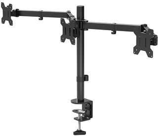 Soporte de mesa para tres monitores de 13 a 24 pulgadas. Permite ajustar la posición de cada pantalla de forma independiente. - Construcción robusta en metal. - Base con pinza para fijación a mesa. - Brazos articulados para ajuste de altura y ángulo.