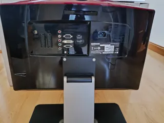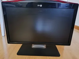 Monitor LG FLATRON M227WDP con acabado en negro y detalles rojos. - Puertos: SCART, VGA, DVI, HDMI, USB. - Conexión de alimentación. - El precio incluye el soporte no original. El monitor se coloca en posición invertida. La imagen es muy buena.