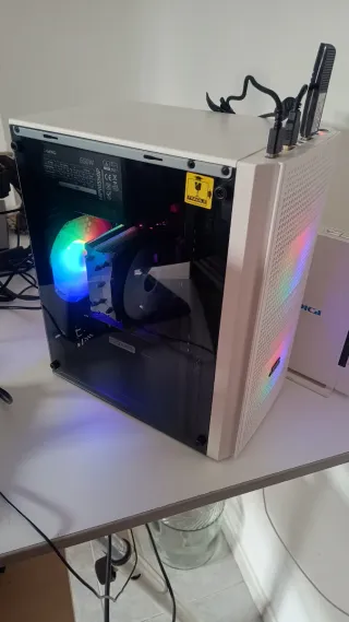 Torre para PC gaming con un diseño moderno y elegante en color blanco. Cuenta con una iluminación LED frontal que varía entre diferentes colores que le da un toque distintivo. - Diseño angular y futurista. - Panel frontal con iluminación LED. - Acabado en blanco mate. Componentes: - Procesador: AMD Ryzen 5 3500X (6 núcleos) + disipador original - Placa base: MSI B450M-A PRO MAX - RAM: 8GB (2x4GB) HyperX DDR4 2400MHz - Almacenamiento: SSD Kingston 240GB - Tarjeta gráfica: NVIDIA GTX 1050 Ti 4GB - Fuente: Corsair CV550 550W 80+ Bronze Se entrega listo para enchufar y usar Precio algo negociable si es serio Pregunta sin compromiso