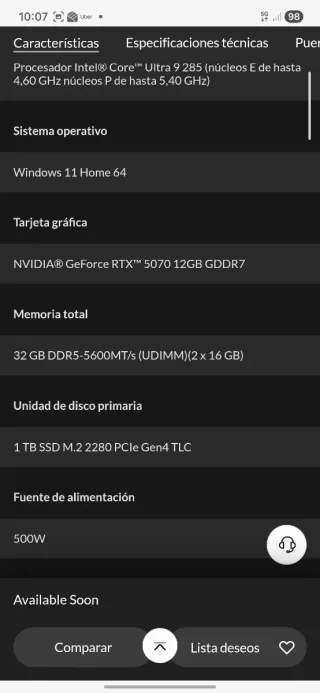 🚀 PC Gaming potente en perfecto estado, ideal para jugar en 1080p/1440p con gráficos altos y para edición o streaming. 💻 Componentes: AMD Ryzen 7 3800X (8 núcleos / 16 hilos) NVIDIA RTX 3060 12GB 16GB DDR4 3200MHz (RGB) SSD 480GB + 2TB HDD Placa Asus B550 Wi-Fi Fuente 750W Seasonic Caja Nfortec RGB con cristal templado ✅ Windows 11 instalado y listo para usar 🎮 Juega a Fortnite, Warzone, GTA V y Cyberpunk en Alto sin problema.