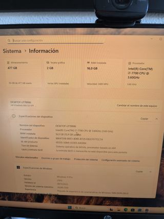 Vendo por futura compra de portátil, bien cuidado, en cuando a videojuegos la 3060 puede correr cualquier juego actual, tiene una nvme interna de 2tb, la más rápida del mercado, el dispositivo de WiFi y bluetooth son externos por usb. Windows 10 instalado Procesador Intel(R) Core(TM) i5-10400F CPU @ 2.90GHz 2.90 GHz RAM instalada 16,0 GB (15,9 GB usable) Almacenamiento 447 GB SSD KIOXIA-EXCERIA SATA SSD, 1.82 TB SSD WD_BLACK SN770 2TB Tarjeta gráfica NVIDIA GeForce RTX 3060 Ti (8 GB) Tipo de sistema Sistema operativo de 64 bits, procesador basado en x64