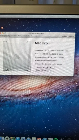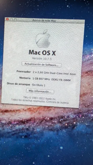 Ordenador Mac Pro de Apple. Este equipo cuenta con un procesador Intel Xeon y memoria DDR2. Sólo torre, teclado y ratón. - Procesador: 2 x 2,66 GHz Dual-Core Intel Xeon - Memoria RAM: 1 GB 667 MHz DDR2 FB-DIMM - Disco de arranque: Sin título 1 - Versión de Mac OS X: 10.7.5