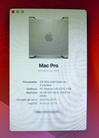 Ordenador Apple Mac Pro 3.1 A1186 en perfecto estado de uso: - 2x CPU Intel Xeon Quad Core 2,8 Ghz - 16 Gb RAM ampliables a 64 - Disco duro SATA III WD Blue 500 Gb + otro igual para datos (dos en total) - Wifi+Bluetooth integrados - Puertos USB - Slots PCIe - Gráfica ATI Radeon HD 5770 1Gb - Posibilidad de instalar más gráficas, tarjetas USB 3.0, etc - Audio integrado alta calidad con baja latencia - Sistema operativo 13.7.8 Ventura - Aceleración gráfica habilitada - Logic X instalado + librerías Vendo uno de los Mac Pro de mi estudio (este es un reserva) para aligerar espacio.