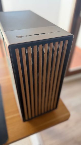 Mini caja para ordenador de sobremesa, ideal para configuraciones gaming compactas. Diseño moderno y funcional. - Panel frontal con rejilla para ventilación. - Puertos frontales: 1x USB-C, 2x USB 3.0, 1x Audio. - Botón de encendido. - Acabado en color negro.