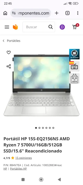 Portátil HP 15S-EQ2156NS con procesador AMD Ryzen 7 5700U, 16GB de RAM y 512GB de SSD. - Pantalla de 15.6 pulgadas. - Incluye cargador USB PD de 30-45W. - Windows preinstalado. Se compró en pc componentes en febrero 2025 y se ha usado 2 veces. Aún tiene su garantía . Precio no negociable
