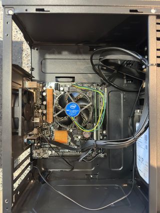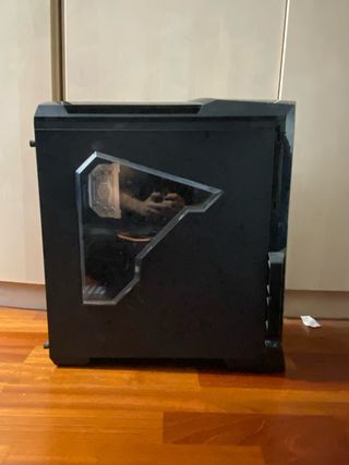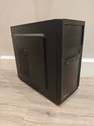 Ordenador de sobremesa para gaming con componentes de calidad. - Carcasa negra. - Múltiples bahías para almacenamiento. - Fuente de alimentación incluida. • Procesador Intel (Core i3 / i5 antiguo, disipador stock) • Placa base ASUS micro-ATX (DDR3) • Memoria RAM 2× HyperX Fury DDR3 (8–16 GB) • Tarjeta gráfica ASUS dedicada (gama baja/media) • Fuente de alimentación TooQ EcoPower II (≈500–600 W) • Almacenamiento SATA (HDD o SSD, no visible) • Ventilador trasero Aerocool