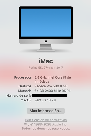 - Funciona perfectamente. Impoluto. Embalado en sus plásticos y caja original. - Se vende por no usarlo hace más de 30 meses. Por motivos laborales tengo que usar un MacBook (movilidad). Características: Ordenador iMac de 27 pulgadas (5K) con procesador Intel i5. - Procesador: Intel Core i5 a 3.8 GHz. - 64 GB RAM - HD 2 TB - Pantalla: 27 pulgadas 5K - Color: Plateado - No se incluye teclado ni ratón ***** PRECIO NO NEGOCIABLE ***** Abstenerse de hacerme ofertas o cambios. Gracias. ***** No hago envíos ***** Prefiero entrega en mano para que se revise y se compruebe que está todo en perfecto estado.