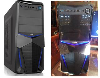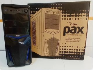 Caja gamin negra con cristal lateral rota y le falta una pata solo es estética no influye en rendimiento por este precio tienes un buen pc - Tarjeta gráfica AMD RX 580. - 16GBdeRAM.hdisipador original del i5 uhb de luces led - Procesador Intel i5 2400. - Disco duro de 1TB (HDD). - Ventilador con luz LED.