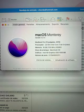 Portátil MacBook Pro de 15 pulgadas, modelo de 2016. Su acabado es gris espacial. - Procesador Intel Core i7. - 16 GB de memoria RAM. - Almacenamiento interno de 2 TB. - Tarjeta gráfica Radeon Pro 460. Ordenador en perfectas condiciones, tan solo tiene la esquina doblada que se observa en la foto, teclado como nuevo y pantalla sin marcas. Es el tope de gama con la mejor grafica y dos terabytes, con bateria con pocos ciclos y en un estado impoluto. No se rebaja.