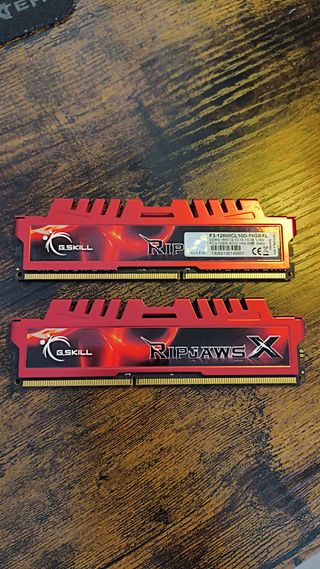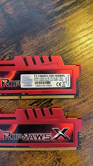 Kit G.Skill Ripjaws X 16GB (2×8GB) DDR3 1600MHz CL10. Funcionan perfectamente, probadas y sin errores. Muy buen estado. Ideales para i7, Xeon, FX y placas DDR3. Precio acorde al mercado. No cambios.