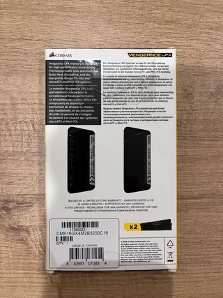 Kit de memoria RAM Corsair Vengeance LPX de alto rendimiento. - Capacidad total: 16GB (2 módulos de 8GB cada uno). - Tipo de memoria: DDR4. - Velocidad: 3200MHz. - Diseño de bajo perfil para mejor compatibilidad. - Soporte para Intel Core i7 y otros procesadores Intel Core.
