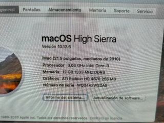 Ordenador Apple iMac de 21,5 pulgadas, modelo de mediados de 2010. - Pantalla de 21,5 pulgadas. - Procesador Intel I3 a 3Ghz - 12gb de ram - Disco solido ssd de 500gb - Tarjeta grafica ATI 256mb dedicada - Diseño elegante en color negro y plateado. - Esteticamente impoluto - Lleva instalado MacOs Montery y va muy fluido mediante Open Core Legacy - No incluye teclado ni raton