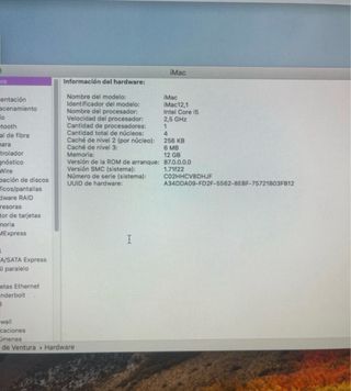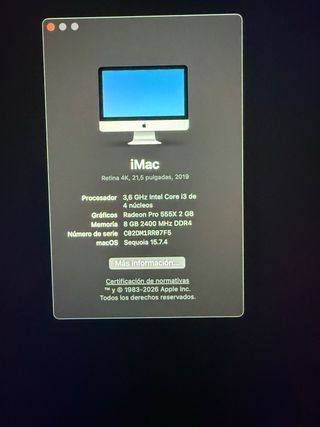 Vendo iMac (21.5-inch, Late 2015) en muy buen estado y funcionando perfectamente. Características: • Pantalla 21,5 pulgadas • Procesador Intel Core i5 1.6 GHz • 16 GB de RAM • Disco duro 1 TB • Gráficos Intel HD Graphics 6000 • Sistema instalado: macOS Monterey El ordenador funciona perfectamente y está listo para usar.
