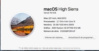 Ordenador Apple iMac de 21,5 pulgadas del año 2011. - Pantalla de 21,5 pulgadas. - Modelo de 2011. Funciona perfectamente. Se puede dar en versión original. Última versión instalada Big Sur, pero se le puede poner hasta la última versión el problema es que no funcionaría el wifi con versiones superiores Consultar