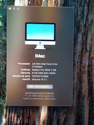 Ordenador iMac de Apple con pantalla de 21.5 pulgadas. - Procesador: Intel Core i3 de 3.6 GHz con 4 núcleos. - Gráficos: Radeon Pro 555X de 2 GB. - Memoria RAM: 8 GB DDR4 a 2400 MHz. - Sistema operativo: macOS Sequoia 15.7.2. - Número de serie: C02ZR17EJWDW. reiniciado por un informático, con factura adjunta