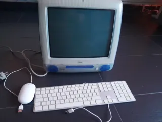 Ordenador iMac G3 de Apple en su icónico diseño. - Color azul y blanco. - Incluye teclado y ratón. - En perfecto estado de funcionamiento.