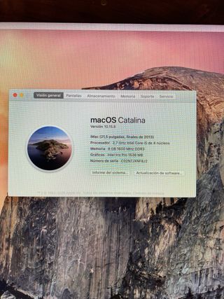 Ordenador iMac de 21,5 pulgadas con procesador i7 y 16GB de memoria RAM en muy buen estado. - Procesador Intel Core i7. - 16GB de memoria RAM, HDD. - Pantalla de 21,5 pulgadas. - disco duro 250gb - Finales de 2013 pero en perfecto estado (sin golpes ni arañazos). - Mac OS Catalina. Teclado y ratón no incluidos