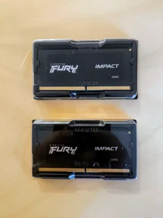 32GB DDR5 XMP EXPO PnP Dual Channel Kingston FURY Impact CL38 (2x16GB) Nuevo Se venden dos Módulos de memoria RAM Kingston FURY Impact DDR5 de 16GB cada uno Modelo: KF548S381B-16 Preparado para Doble Canal de Memoria RAM Intel XMP 3.0 and AMD EXPO Aceleración Plug N Play Capacidad: 32GB (2x16GB) Velocidad: 4800MT/s Configuración: 1Rx8 CL38 Formato: SO-DDIM, para portátil o Mini PC Tipo: DDR5 262 Pines Producto Original Nuevas, sin uso En perfecto estado