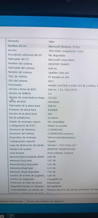 Ordenador HP ProOne 600 G3 Todo en uno (AllinOne) Pantalla 22" Full HD Intel i5-7500 3.4 Ghz 8 Gb Ram (Ampliable a 16 Gb) Disco 1 TB (Disco SSD 480 Gb + 25€) Webcam, WiFi, Bluetooth, grabadora DVD, 6 puertos USB, Ethernet, DisplayPort Windows 11 y Office 2021 recién instalado Perfecto funcionamiento Peana regulable en altura Perfecto para Teletrabajo, ofimática, estudio, etc. No es táctil Teclado y ratón inalámbricos incluido Hago envíos