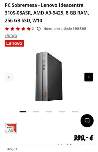 Ordenador de sobremesa Lenovo IdeaCentre 310S‑08ASR, referencia 90G9009RSP (EAN 0193638231639). Dispone de un procesador AMD A9‑9425 (2 núcleos, 3,1 / 3,7 GHz) con gráficos integrados Radeon R5. Tiene 8 GB de RAM DDR4 (1 módulo, ampliable hasta 16 GB). Su almacenamiento es un SSD de 256 GB. Conectividad: red Gigabit (Ethernet 1000 Mbps), Wi‑Fi 802.11ac y Bluetooth 4.0. En cuanto a puertos, incluye VGA, HDMI, USB 3.1 Gen 1 y varios USB 2.0. Sistema operativo: Windows 10 Home 64 bits. El chasis es compacto tipo SFF con dimensiones de 90 × 297 × 344 mm y peso de 4,3 kg. Color: negro con frontal plateado. Ideal para tareas domésti...