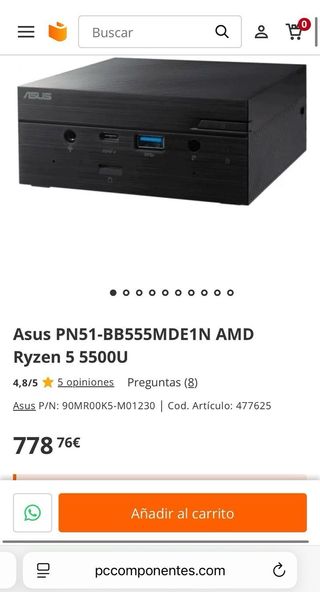 Vendo mi mini PC Asus PN51-B555MDE1N AMD Ryzen 5 5500U. - Procesador AMD Ryzen 5 5500U - Modelo: PN51-B555MDE1N - Diseño compacto y elegante. Permite conectar simultáneamente hasta cuatro monitores 4K. Imágenes 8K UHD a un máximo de 60 Hz a través de DisplayPort™ Dual-Mode (DP++). Dos puertos USB 3.2 Gen 2 de tipo C compatibles con DisplayPort 1.4. Intel Wi-Fi 5 (802.11ac) y Bluetooth 5.0 facilitan unas conexiones rápidas y sin cables. Puerto configurable: (DisplayPort 1.4 o 1.2, VGA, Ethernet o COM)