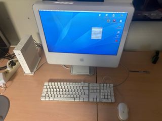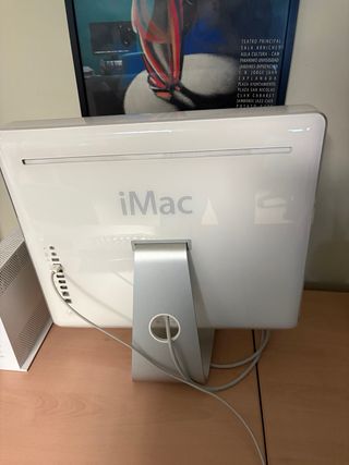 Ordenador de sobremesa Apple iMac G5. - Color blanco. - Pantalla integrada, diseño todo en uno, teclado USB y ratón. - Un clásico de Apple con diseño icónico. - Tiene metido un CD en su ranura que no logramos expulsar pero puede conectarse a un CD externo.